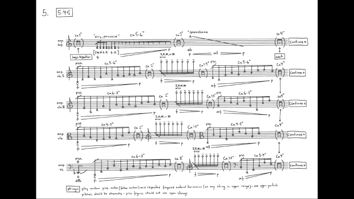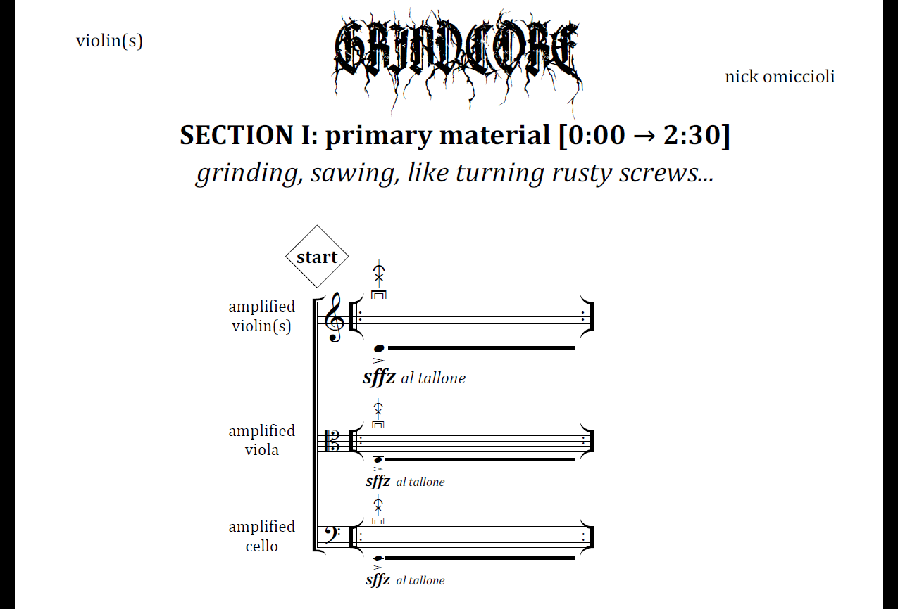 chamber music Haunted Seas (2018) for soprano and string quartet audio/score sample: GRINDCORE (2016) for amplified string trio audio/score sample: slide (2018) for violin & reverb/delay pedals score sample: